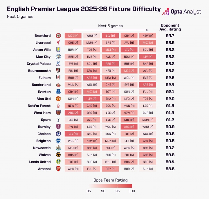 直播吧10月02日讯 Opta发布了25-26赛季未来五轮赛程难度评级,数据分析显示,布伦特福德将面临最严峻的考验。 布伦特福德未来五个对手的平均评分高达94.7,位居各队之首。其赛程依次为:主场迎战曼城、客场挑战西汉姆联、主场对阵利物浦、客场对阵水晶宫,最后回到主场迎战纽卡。 紧随其后的是利物浦,其对手平均评分为93.5。红军将先后客场挑战切尔西、主场迎战曼联、客场对阵布伦特福德、主场迎战维拉,最后客场对阵曼城。 阿斯顿维拉、曼城以及水晶宫三支球队并列第三,对手平均评分均为93.3。其中,曼城的赛程尤为引人注目,他们将连续客场挑战布伦特福德和维拉,并在最后一场比赛中主场迎战利物浦。 相比之下,阿森纳的赛程最为轻松,未来五个对手的平均评分仅为88.6。枪手将先后主场迎战西汉姆联、客场挑战富勒姆、主场对阵水晶宫、客场挑战伯恩利,最后客场对阵桑德兰。 |